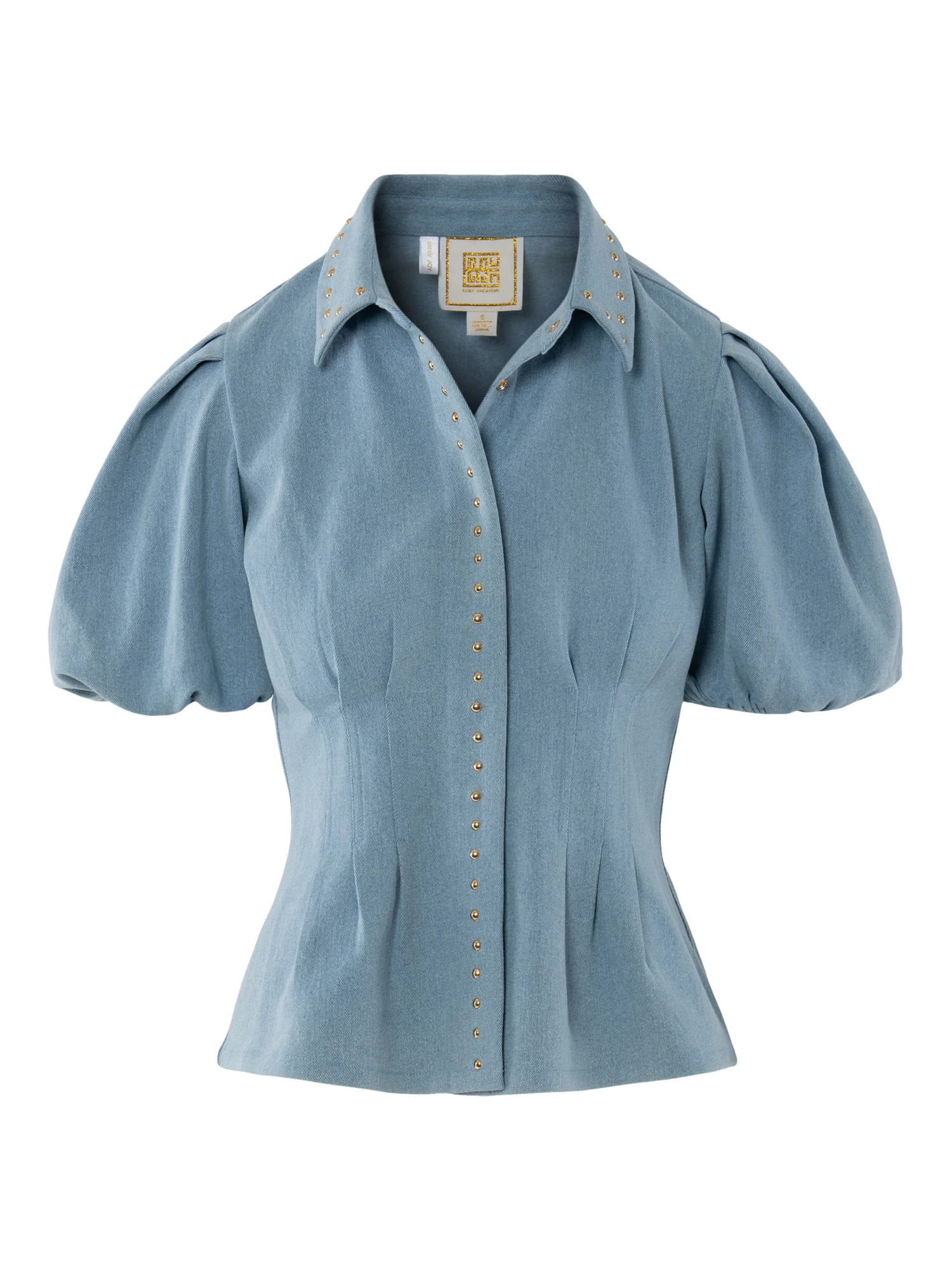 The Britt Top redefines denim with a feminine edge. Featuring a classic fold collar, puff sleeves with elastic cuffs, and a lightly boned bodice, this style offers both structure and ease. A concealed front button closure is framed by a gold-studded panel, adding a subtle western-inspired detail. Crafted in stretch denim, it flatters the figure while providing comfort, making it as timeless as it is on trend. Pair with the matching Paisley Pant for a full denim look that’s effortlessly chic and designed to turn heads.