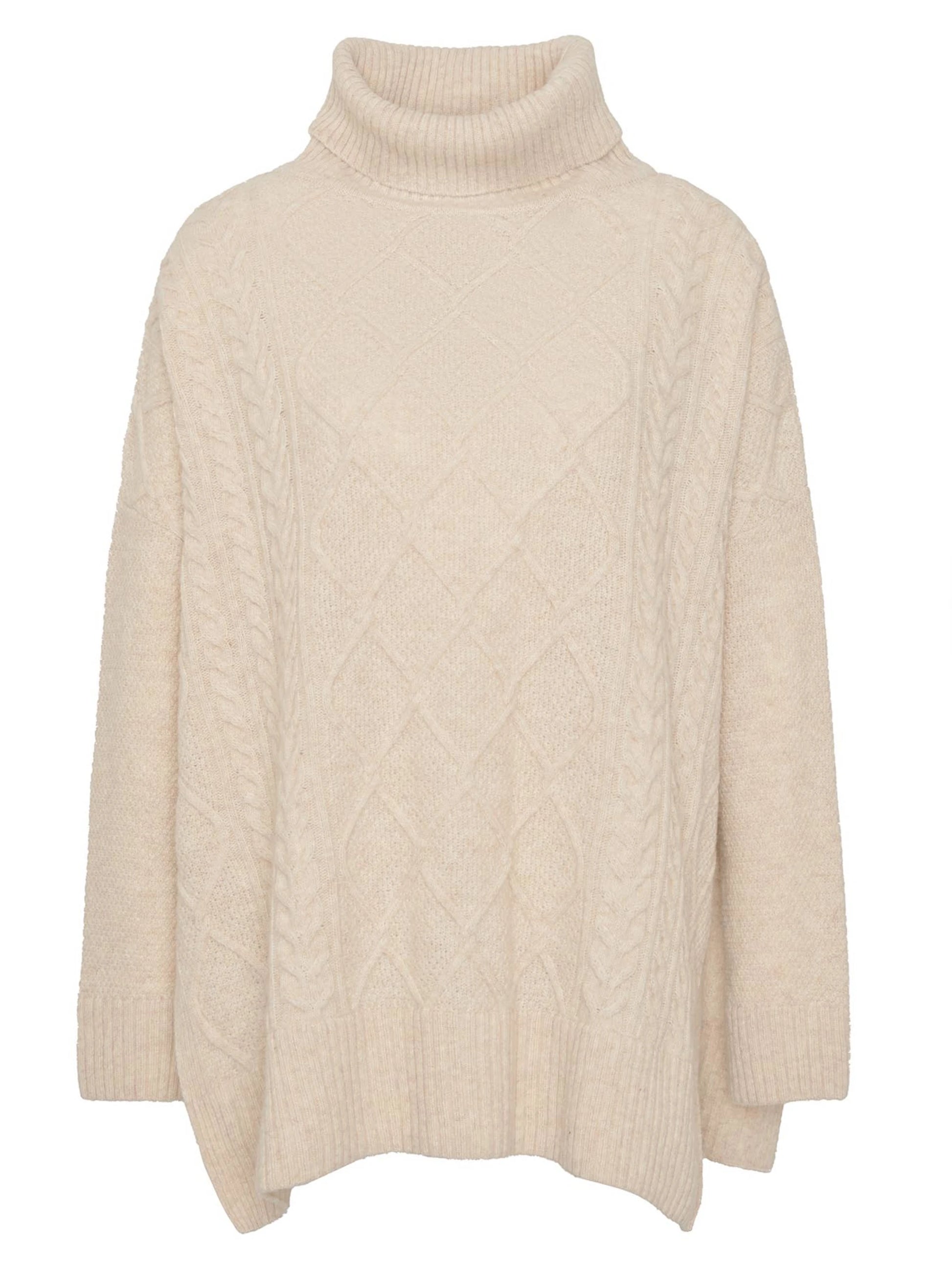 The Barbour Burne cape is imagined in a warm wool-blend fabric with a roll neck and long sleeves. It’s detailed with an argyle-inspired cable knit, making it a stylish option for updating casualwear looks.