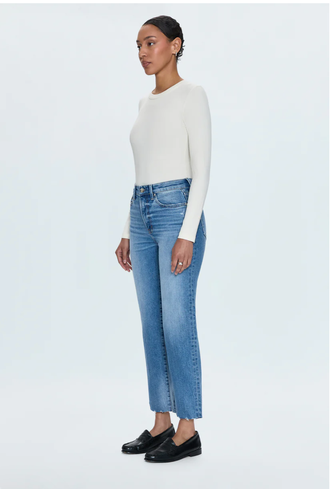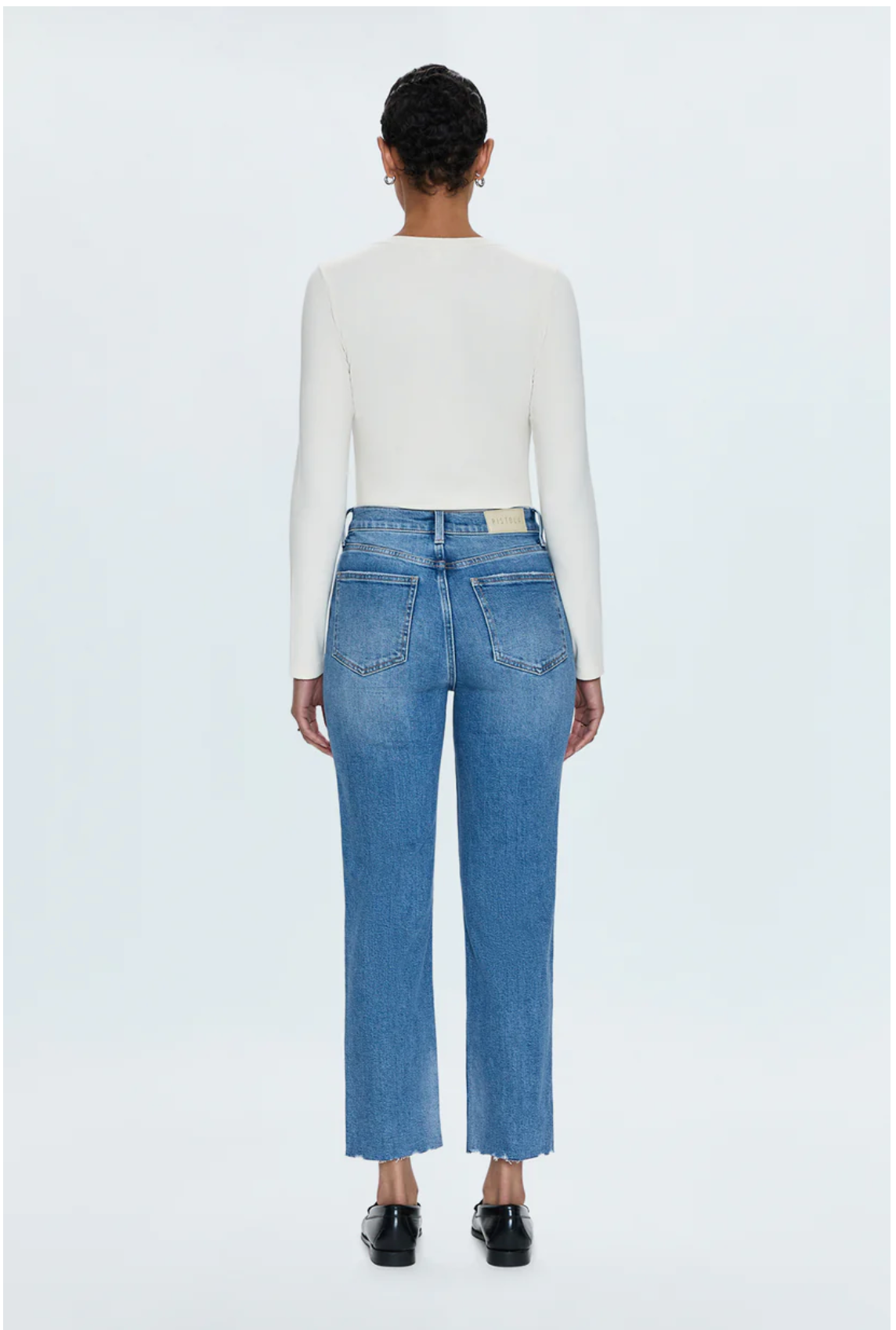 High rise, figure hugging waist that falls to a slim-straight leg silhouette with a cropped, clean finished hem. Crafted from our signature comfort stretch denim for an expert fit and feel. Rhythm Vintage is a classic medium blue denim wash with moderate fading and whiskering and clean finishes.