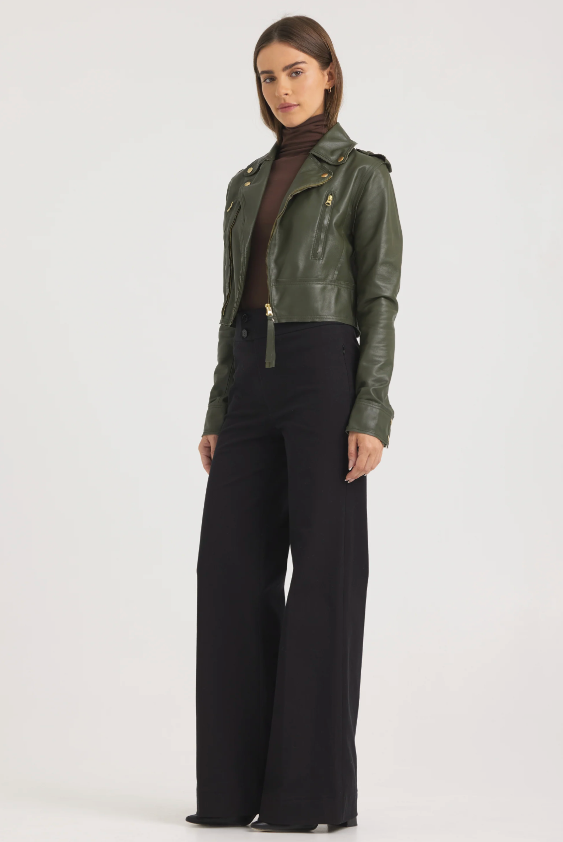 The tastemaker. A cropped motorcycle leather jacket featuring a snap-down lapel and collar, zippered pockets and wire inserts in collar, lapels, pocket flaps and cuffs. Opt for a sleek monochromatic look for the ultimate in city girl chicness.