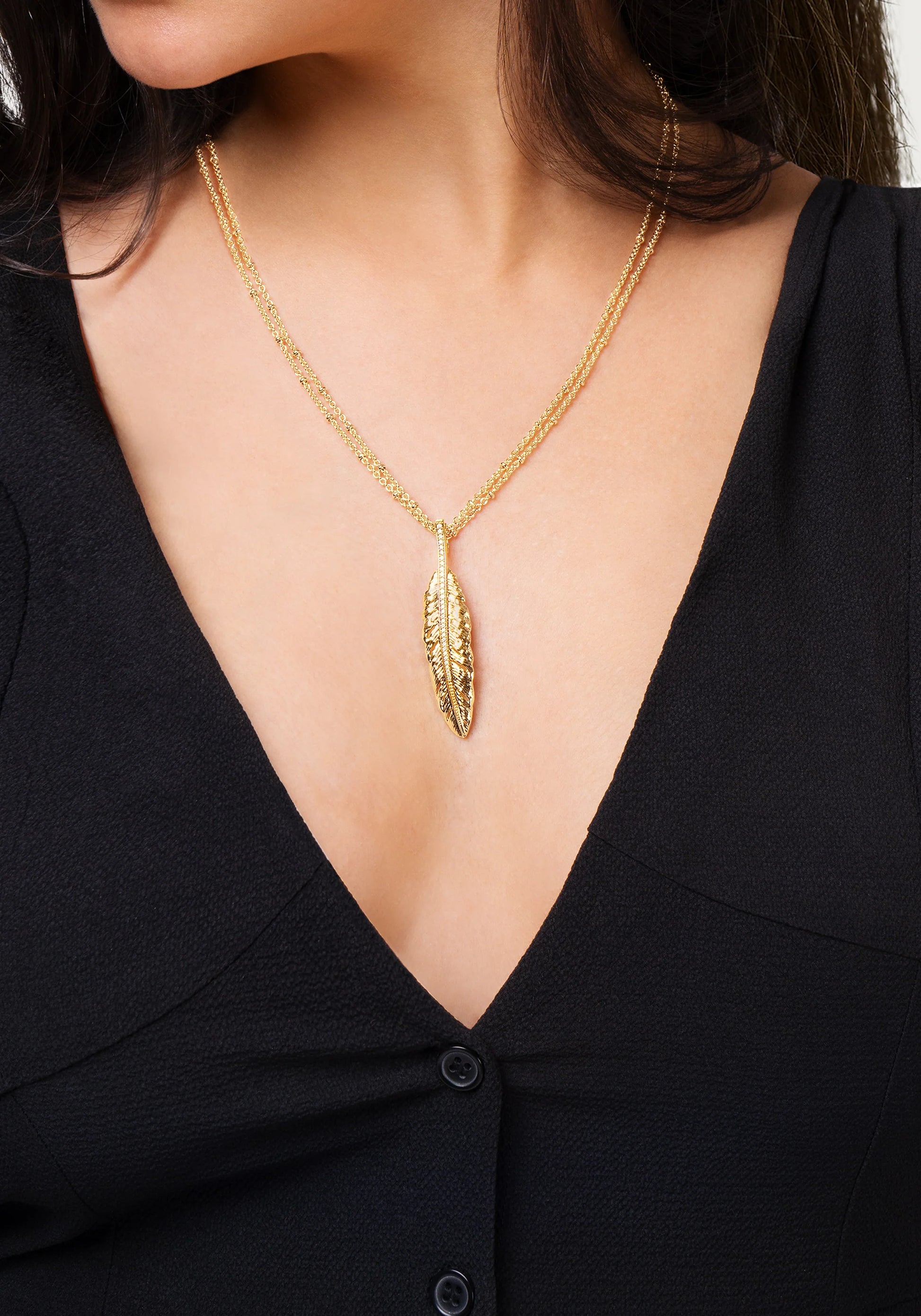 This necklace features a removable gold feather pendant with our signature gold molten bead chain necklace. It's intricate detailing capturing every subtle curve and texture of a real feather. This elegant piece combines nature inspired design with luxurious craftsmanship, making it a versatile accessory that can elevate both casual and formal outfits.