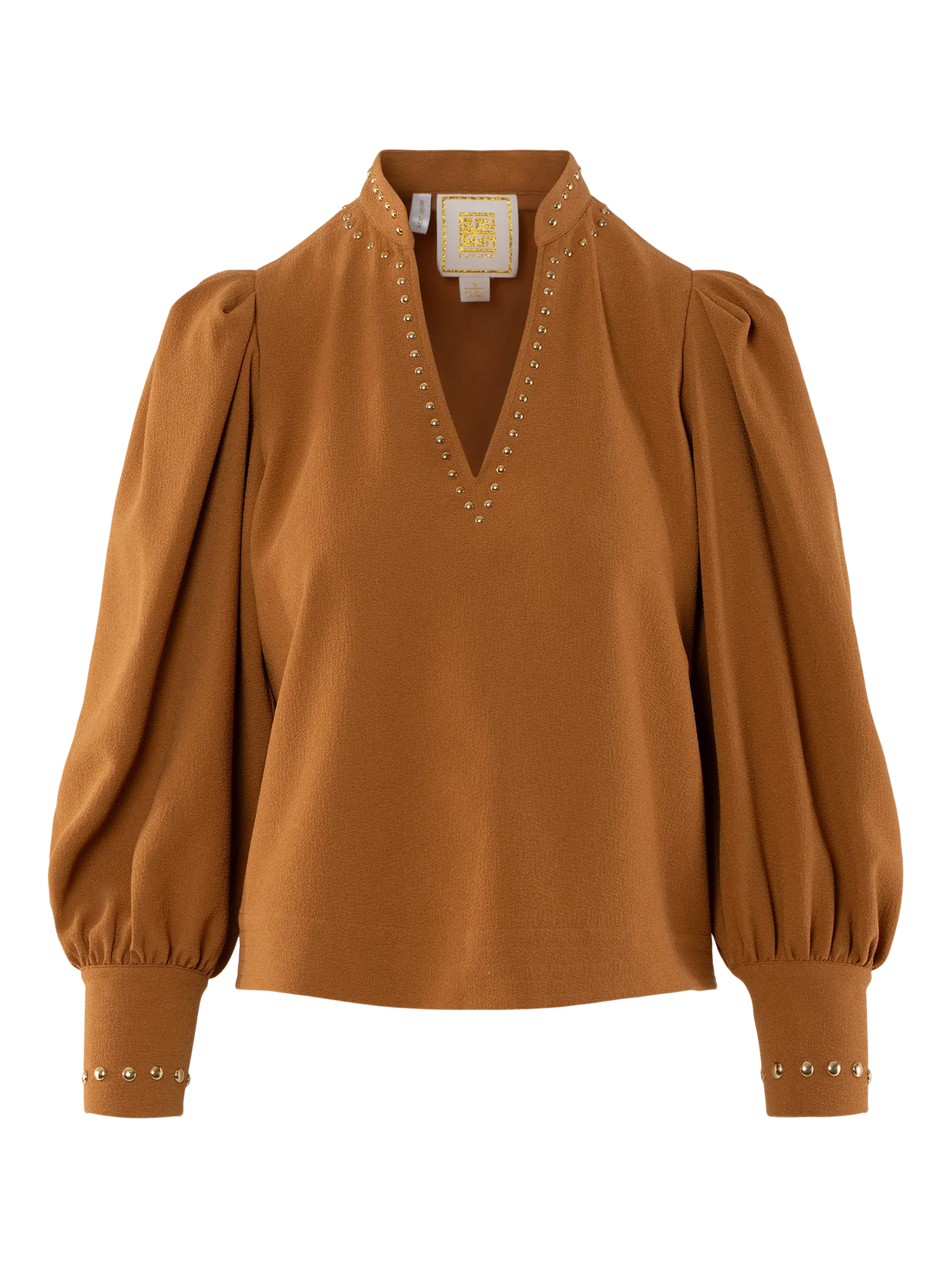 The Hampton Top in Brown Sugar brings a refined edge to everyday dressing. Featuring blouson sleeves with cuffed finishes and a flattering V-neckline, this silhouette is elevated by gold stud detailing along the neckline and wrist cuffs. The subtle western chic style adds a nod to Texas roots, while the warm tone and timeless cut make it a versatile piece for seasonal transitioning.