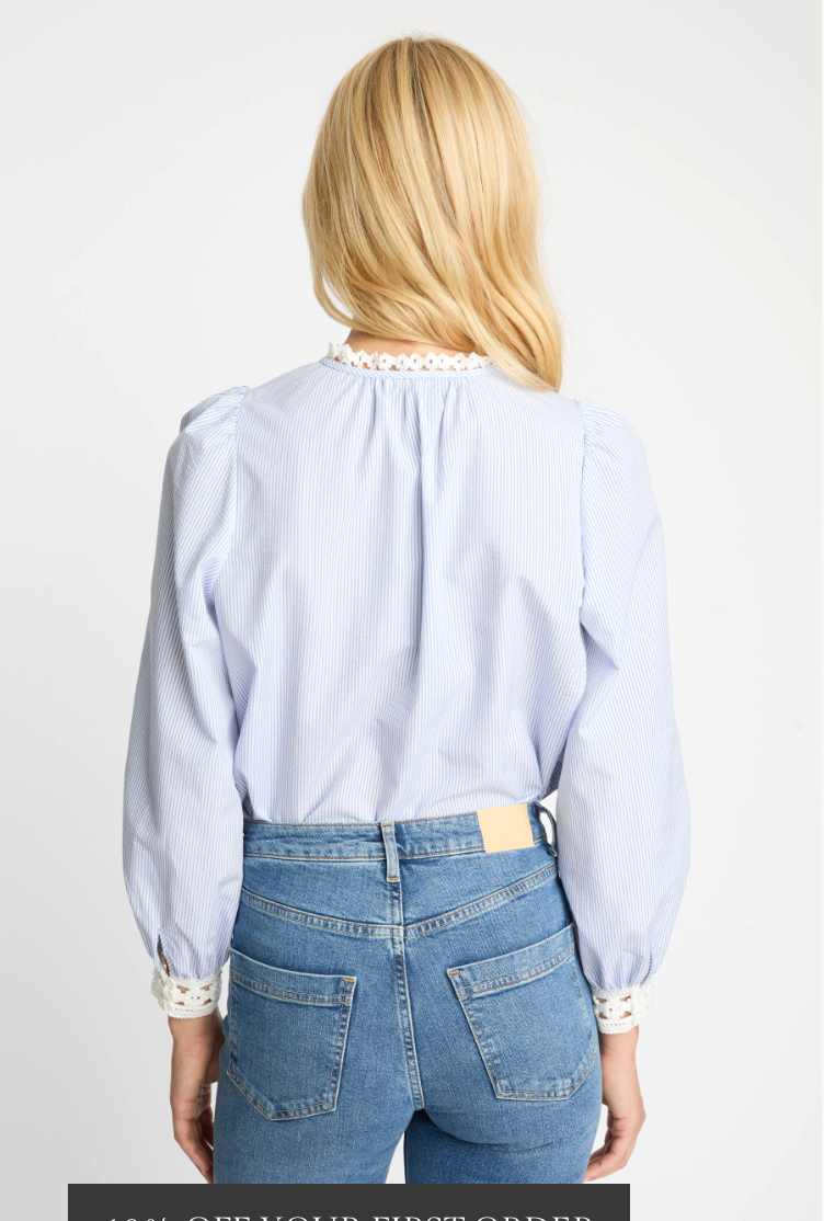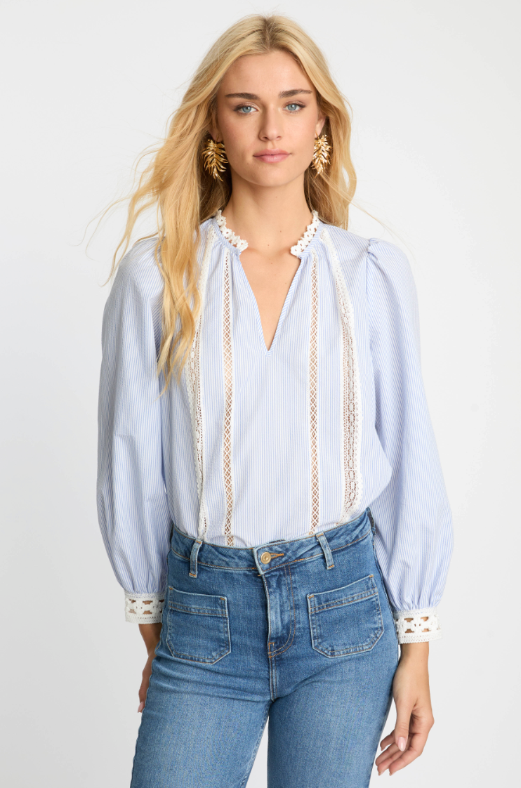 The Lena Top captures effortless charm with its breezy silhouette and delicate feminine details. Crafted from breathable blue and white seersucker, this lightweight blouse offers a relaxed fit that feels both comfortable and polished, making it a versatile piece for everyday wear.