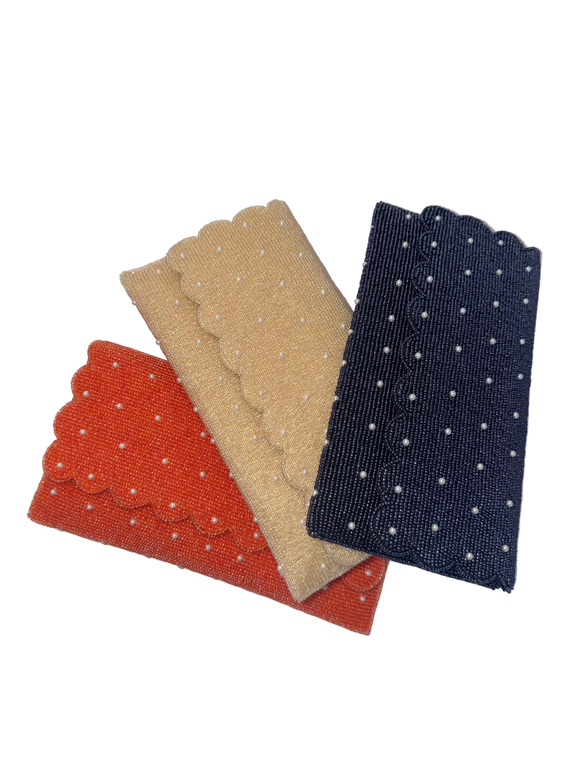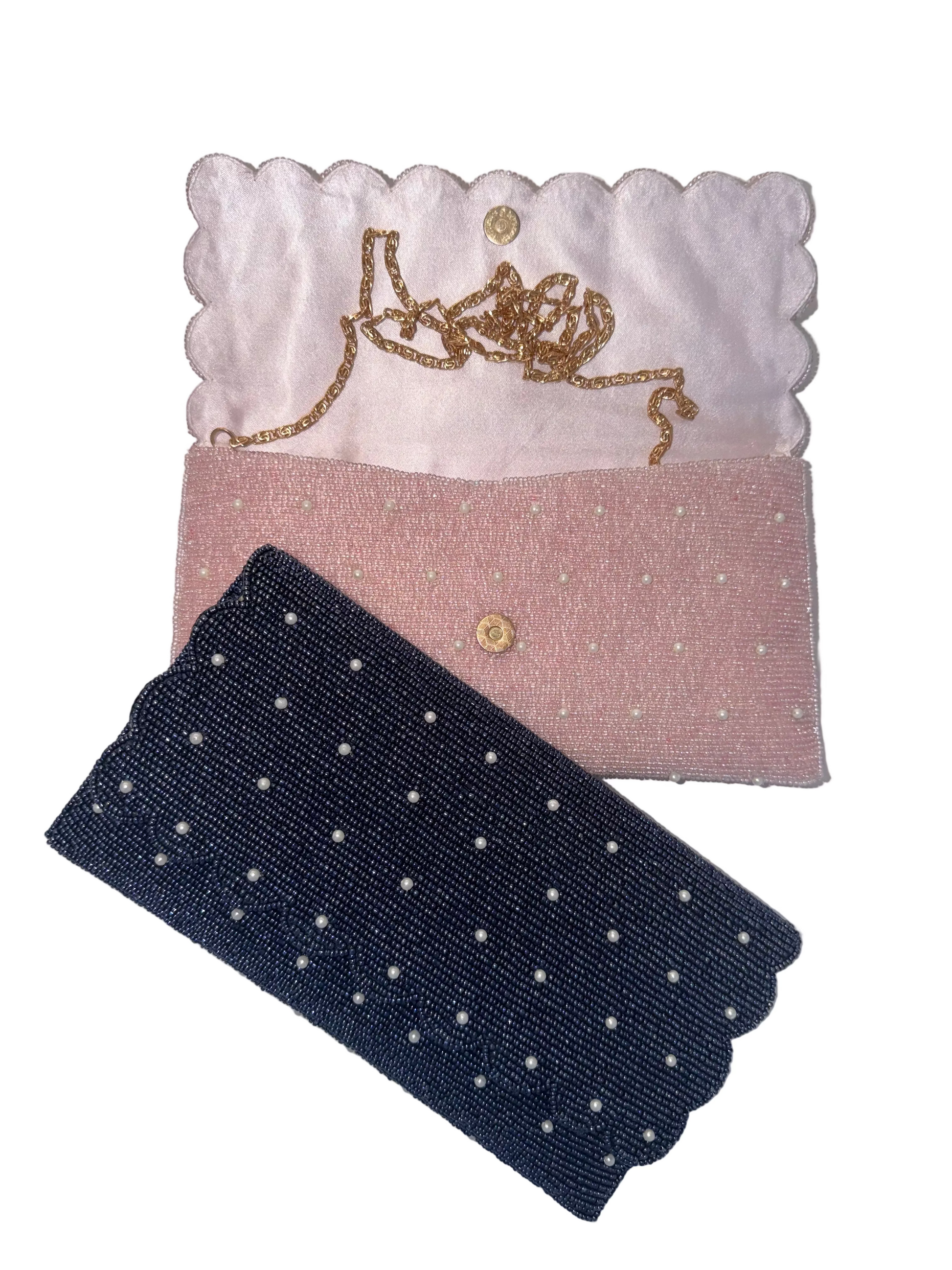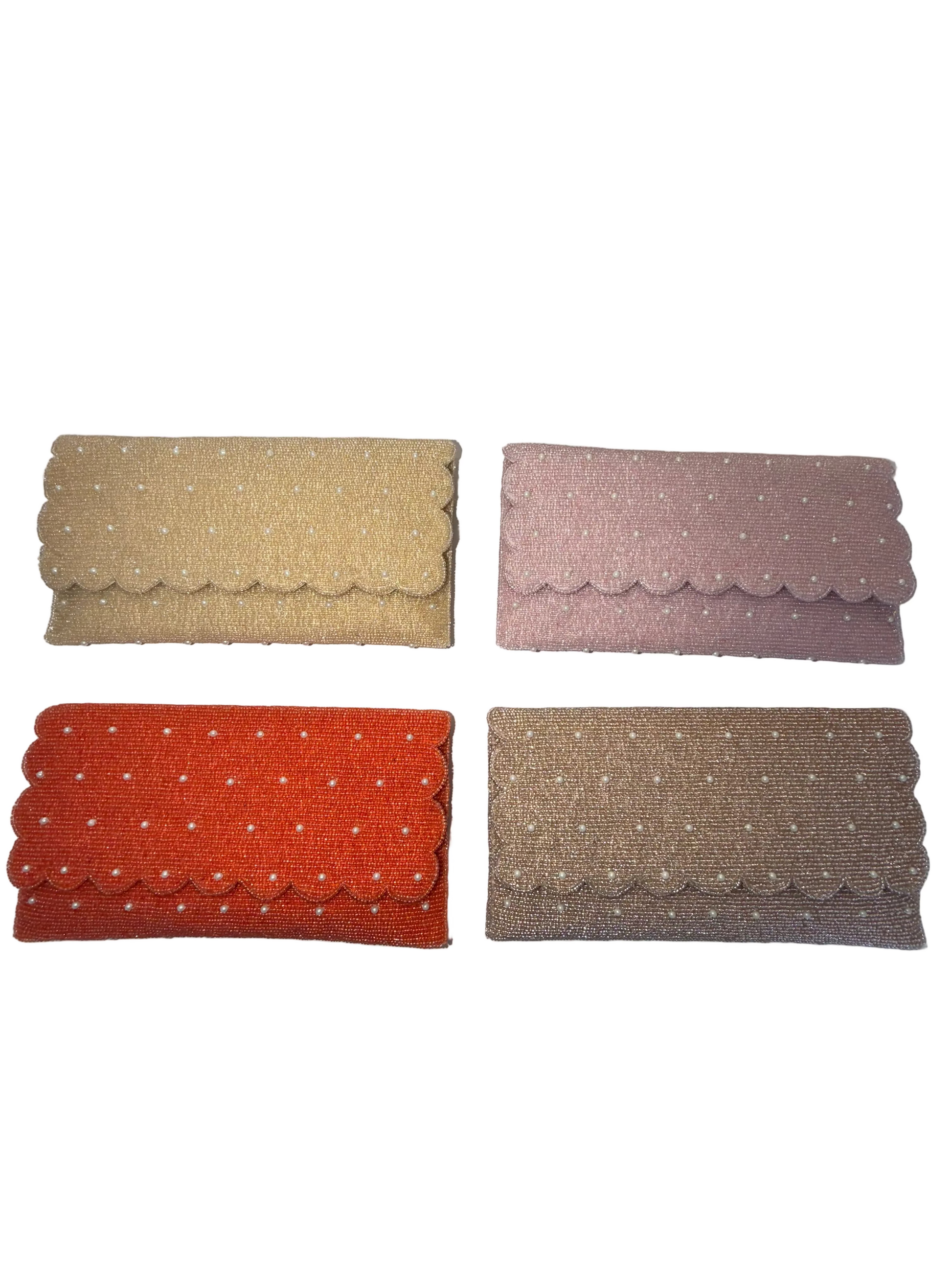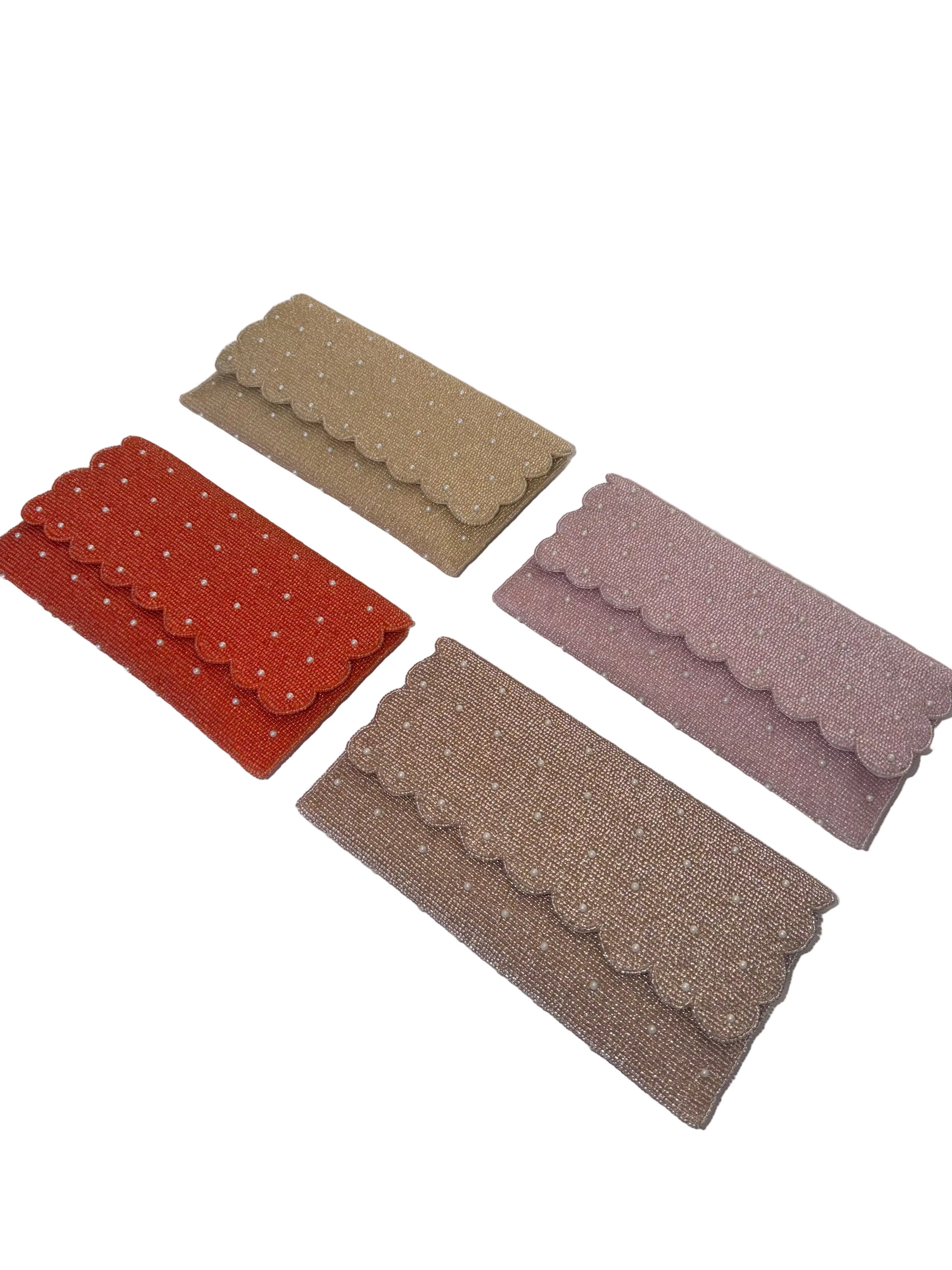 Adorable foldover handbag featuring a scalloped wavy texture adorned with delicate mini pearls. Handcrafted in India with meticulous beadwork, this elegant piece transitions seamlessly from casual to dressy occasions. Available in multiple colors to match your style.