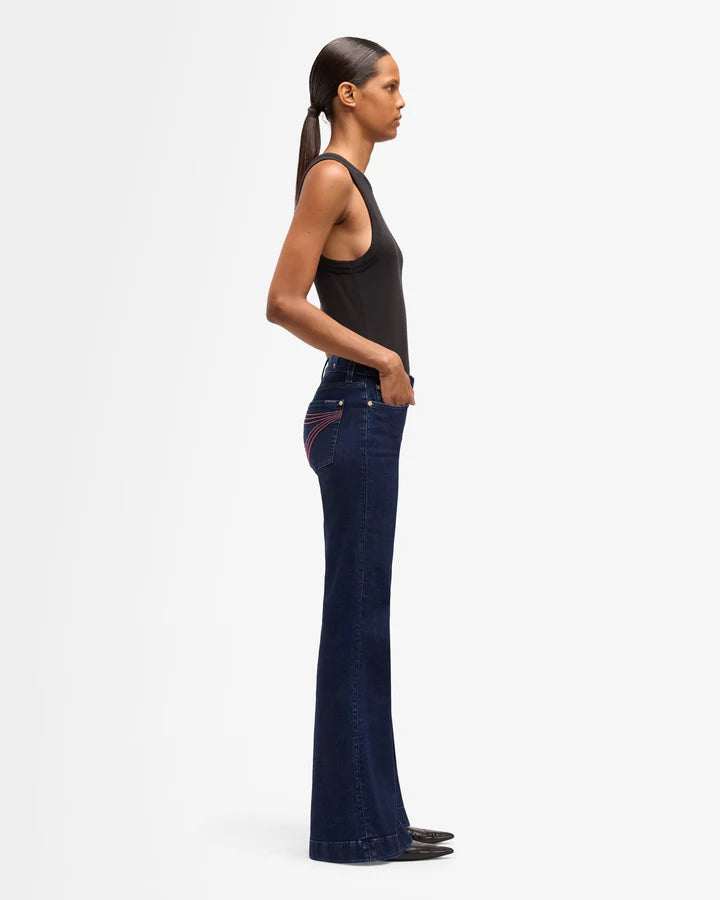 Fits like: Fitted through the hips and thighs. This mid rise denim has a wide, full-length leg and a subtle flare for a long, lean silhouette.